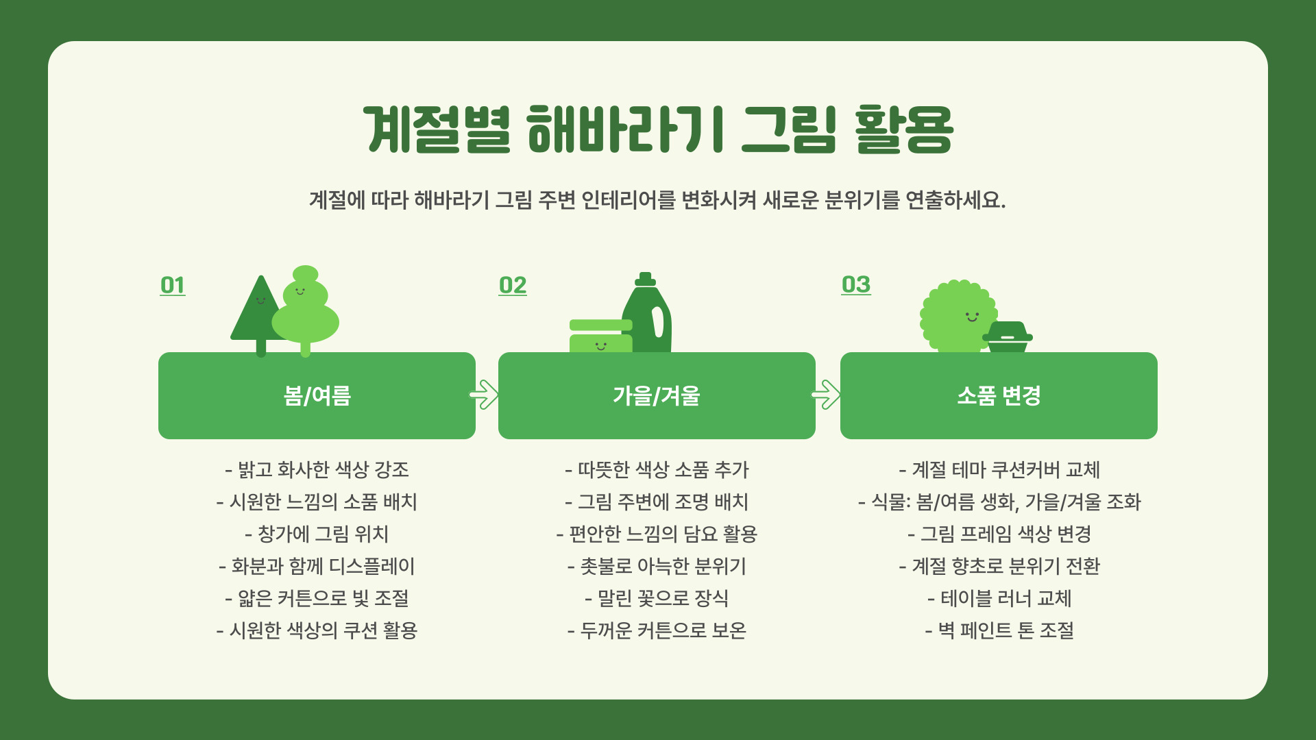 해바라기그림은 다양한 소품과 함께 사용할 수 있습니다. 소품은 그림과의 조화로 거실의 분위기를 더욱 돋보이게 해 줍니다. 해바라기색을 가진 쿠션이나 러그를 잘 선택하면 자연스럽게 공간에 통일감을 줄 수 있습니다. 이렇게 소품들을 활용하면 전체적인 디자인이 균형을 이루게 됩니다.